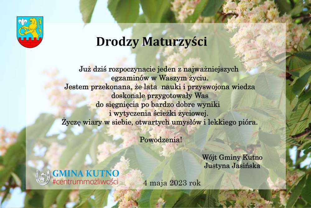 Dziś ważny dzień dla wszystkich Maturzystów. Wójt Gminy Kutno Justyna Jasińska życzy połamania piór !