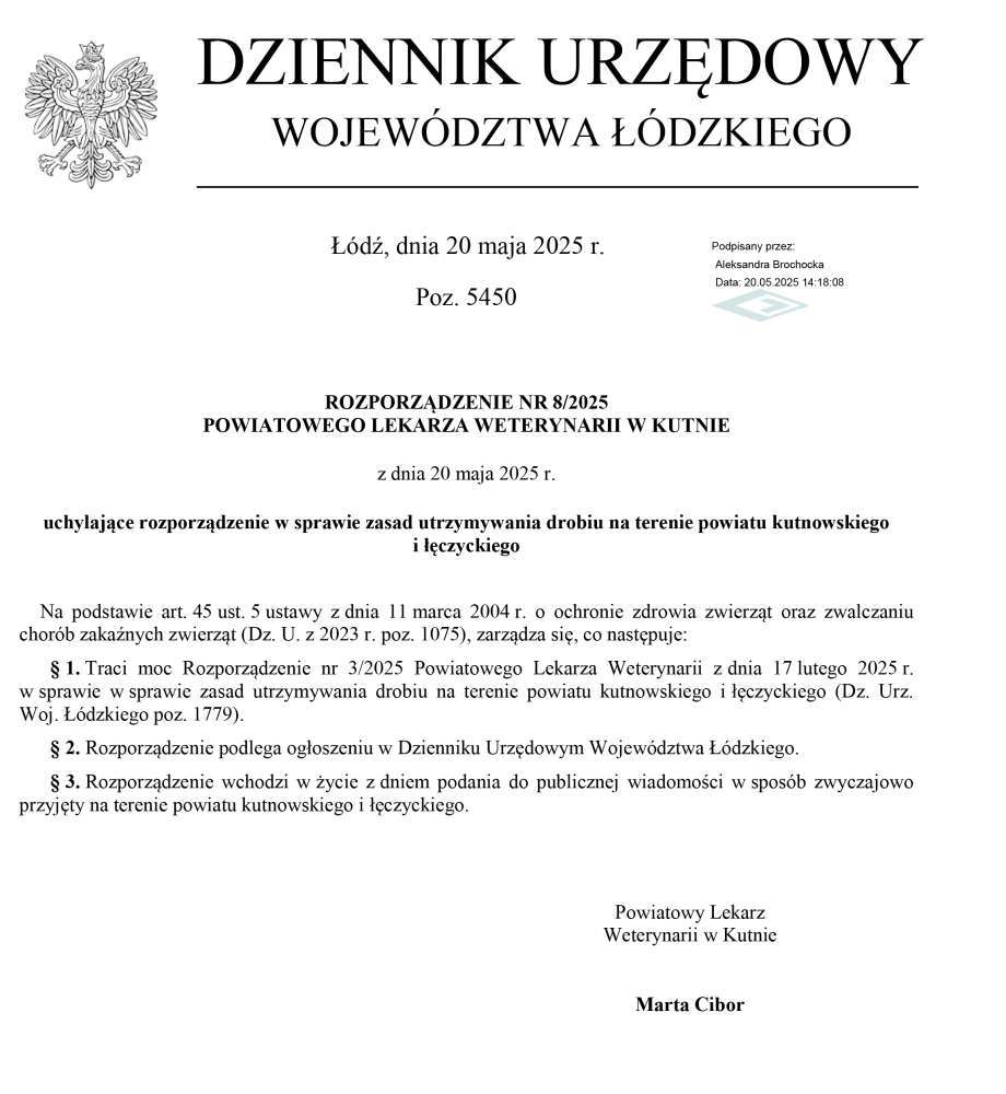 Poniżej  treść Rozporządzenie nr 8/2025 Powiatowego Lekarza Weterynarii w Kutnie z dnia 20 maja 2025 r. uchylające rozporządzenie w sprawie zasad utrzymywania drobiu na terenie powiatu kutnowskiego i łęczyckiego.