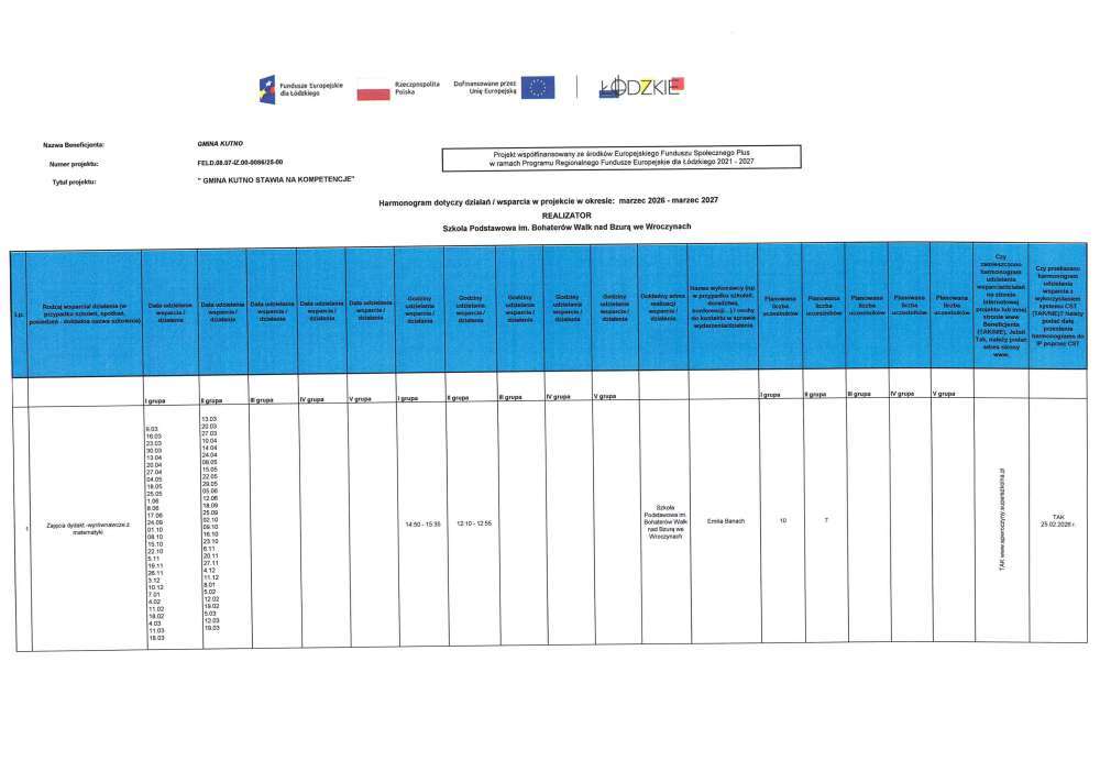 Poniżej przedstawiamy szczegółowy harmonogram wsparcia dla szkoły podstawowej we Wroczynach w ramach projektu "Gmina Kutno stawia na kompetencje".