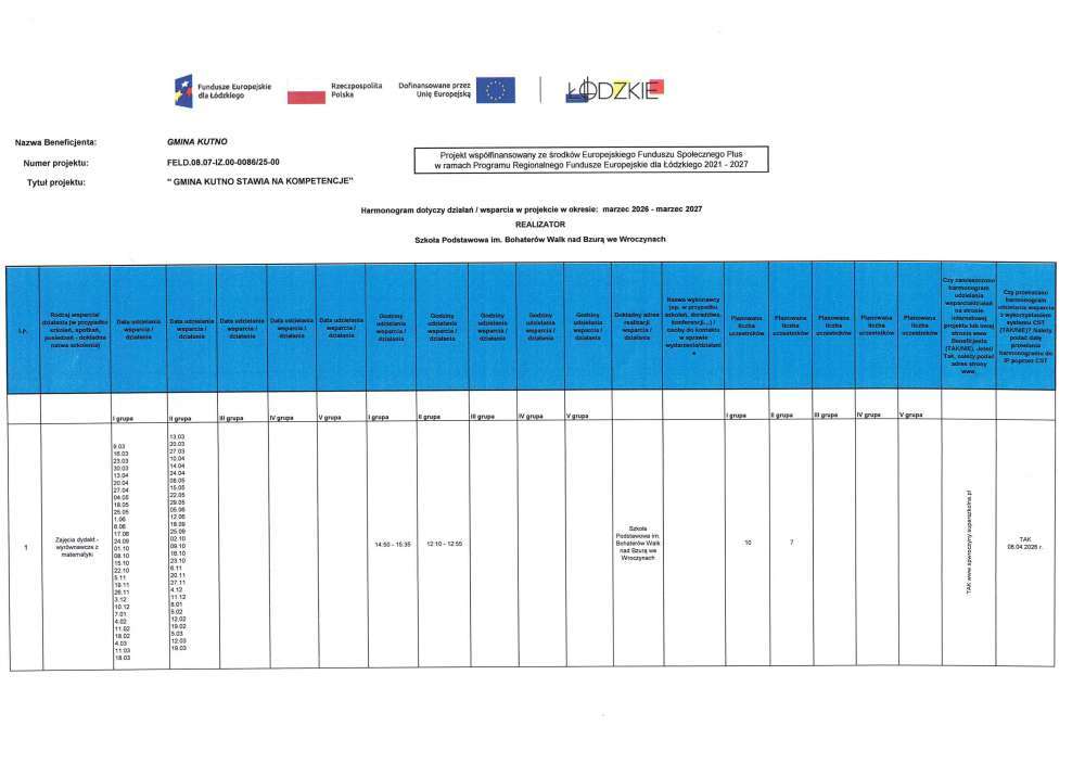Poniżej przedstawiamy szczegółowy harmonogram wsparcia dla szkoły podstawowej we Wroczynach w ramach projektu "Gmina Kutno stawia na kompetencje"