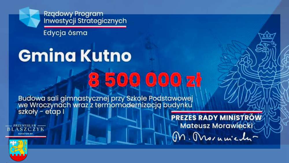 Miło nam poinformować, że Gmina Kutno otrzymała dotację z Rządowego Programu Inwestycji Strategicznych. Wójt Gminy Kutno Justyna Jasińska odebrała z rąk Senatora Przemysława Błaszczyka promesę w wysokości 8 500 000 zł Środki te zostaną przeznaczone na budowę długo wyczekiwanej sali gimnastycznej przy Szkole Podstawowej we Wroczynach wraz z termomodernizacją budynku szkoły.