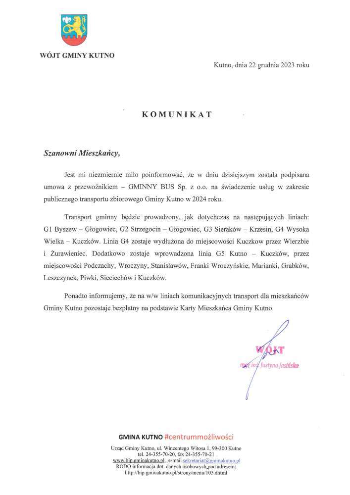 Wójt Gminy Kutno Justyna Jasińska informuje, że w dniu dzisiejszym została podpisana umowa z przewoźnikiem – GMINNY BUS Sp. z o.o. na świadczenie usług w zakresie publicznego transportu zbiorowego Gminy Kutno w 2024 roku.