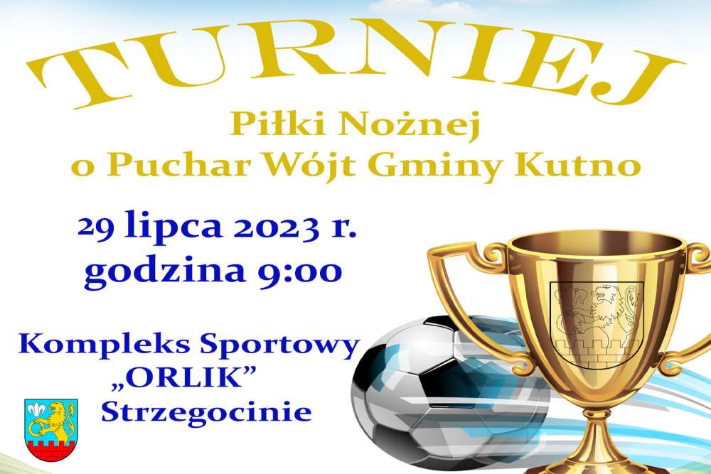 Wójt Gminy Kutno Justyna Jasińska zaprasza do udziału w Turnieju Piłki Nożnej o Puchar Wójt organizowanym w dniu 29 lipca 2023 roku na boisku sportowym „Orlik" w Strzegocinie.