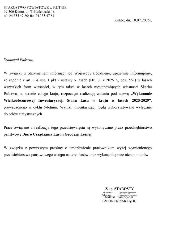 Poniżej informacja Starostwa Powiatowego w Kutnie dotycząca realizacji zadania pod nazwą „Wykonanie Wielkoobszarowej Inwentaryzacji Stanu Lasu w kraju w latach 2025-2029".
