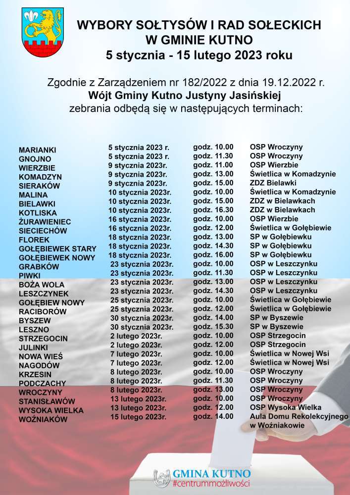 W związku z upływająca kadencją Sołtysów i Rad Sołeckich w gminie Kutno Zarządzeniem Nr 182/2022 z dnia 19 grudnia 2022 r. Wójt Gminy Kutno Justyna Jasińska zwołała Zebrania Wiejskie, na których mieszkańcy poszczególnych sołectw dokonają wyboru sołtysa i rady sołeckiej na kolejne cztery lata.