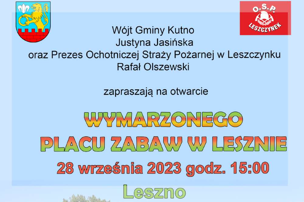 Wójt Gminy Kutno Justyna Jasińska i Prezes Ochotniczej Straży Pożarnej w Leszczynku Rafał Olszewski zapraszają na otwarcie Wymarzonego Placu Zabaw w Lesznie, które odbędzie się 28 września o godzinie 15:00.