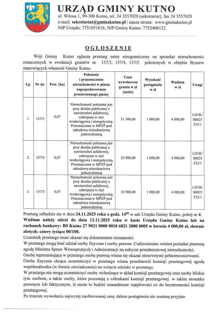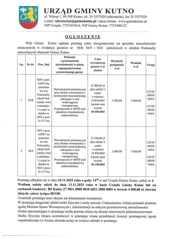 Poniżej treść ogłoszeń Wójta Gminy Kutno przetargów ustnych nieograniczonych na sprzedaż nieruchomości .