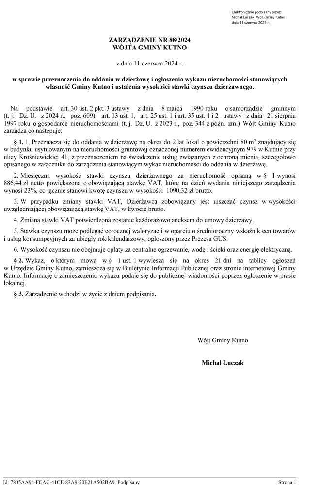 Poniżej treść zarządzenia wójta gminy Kutno w sprawie przeznaczenia do oddania w dzierżawę i ogłoszenia wykazu nieruchomości stanowiących własność Gminy Kutno i ustalenia wysokości stawki czynszu dzierżawnego.