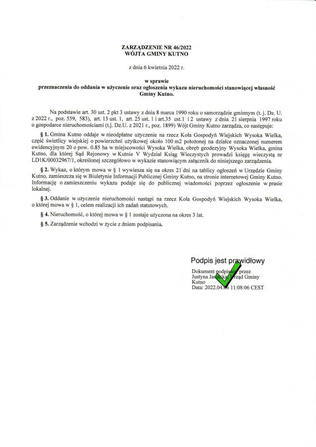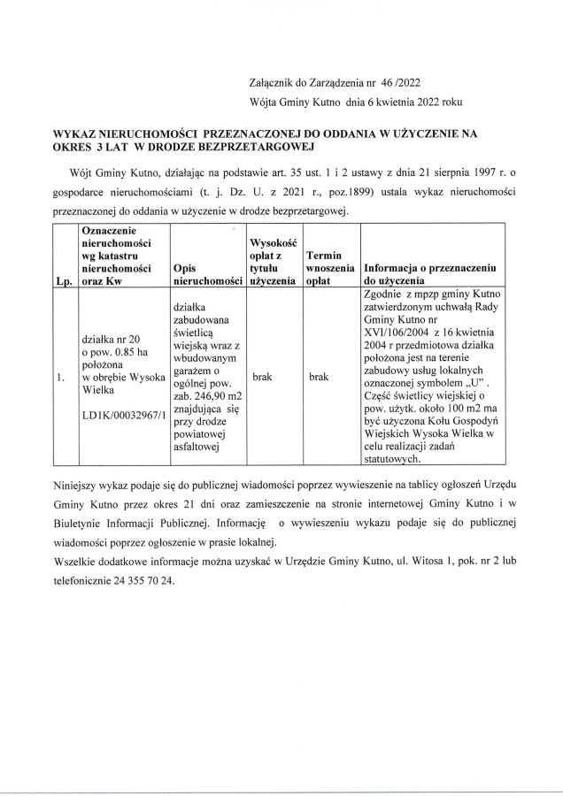 Poniżej treść zarządzenie Wójta Gminy Kutno z dnia 06.04.2022r. w sprawie przeznaczenia do oddania w użyczenie oraz ogłoszenia wykazu nieruchomości stanowiącej własność Gminy Kutno