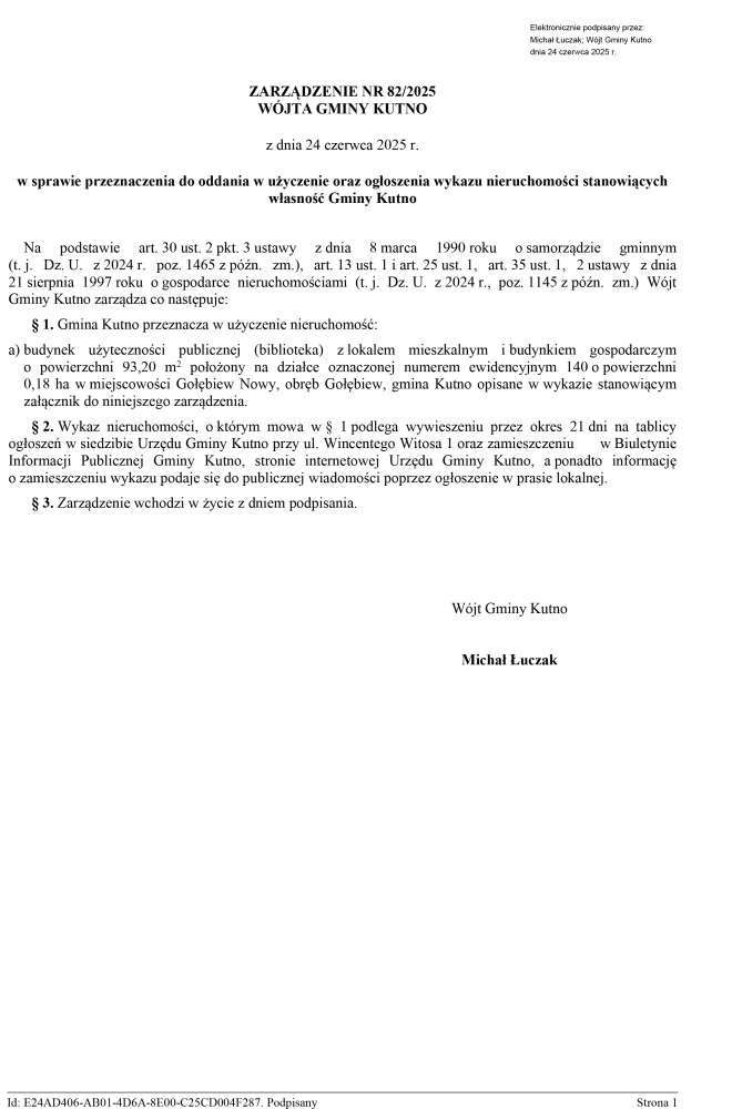 Poniżej treść zarządzenia Wójta Gminy Kutno w sprawie przeznaczenia do oddania w użyczenie oraz ogłoszenia wykazu nieruchomości stanowiących własność Gminy Kutno