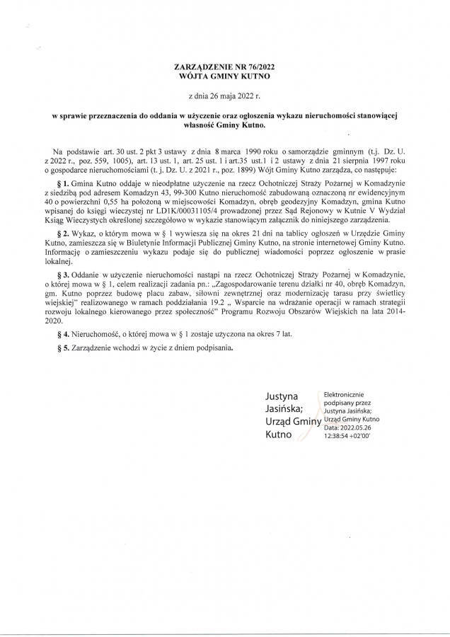 Poniżej treść zarządzenie Wójta Gminy Kutno z dnia 26.05.2022r. w sprawie przeznaczenia do oddania w użyczenie oraz ogłoszenia wykazu nieruchomości stanowiącej własność Gminy Kutno