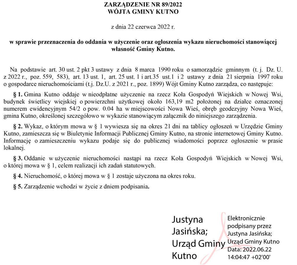 Poniżej treść Zarządzenia NR 89/2022 Wójta Gminy Kutno z dnia 22 czerwca 2022 r.w sprawie przeznaczenia do oddania w użyczenie oraz ogłoszenia wykazu nieruchomości stanowiącej własność Gminy Kutno.