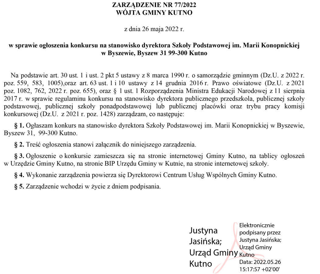 Zarządzenie w sprawie ogłoszenia konkursu na stanowisko dyrektora Szkoły Podstawowej w Byszewie
