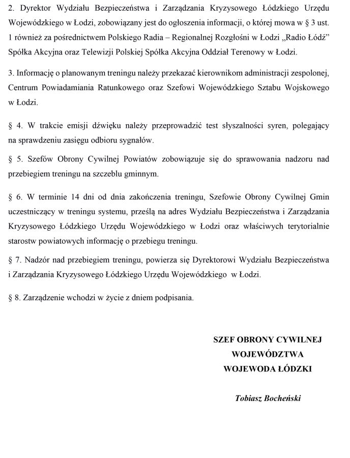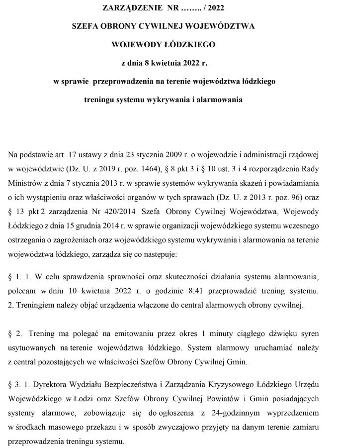 Zarządzenie Szefa Obrony Cywilnej Województwa Wojewody Łódzkiego w sprawie przeprowadzenia na terenie województwa łódzkiego treningu systemu wykrywania i alarmowania