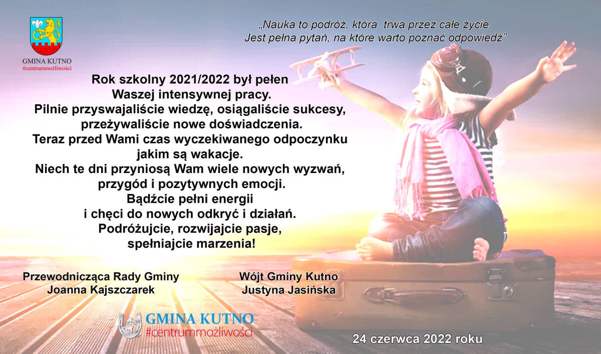 Z okazji zakończenia roku szkolnego 2021/2022 Wójt Gminy Kutno Justyna Jasińska przekazała podziękowania i życzenia dla Uczniów, Rodziców oraz Dyrektorów, Nauczycieli i pozostałych Pracowników Szkół z terenu Gminy Kutno.