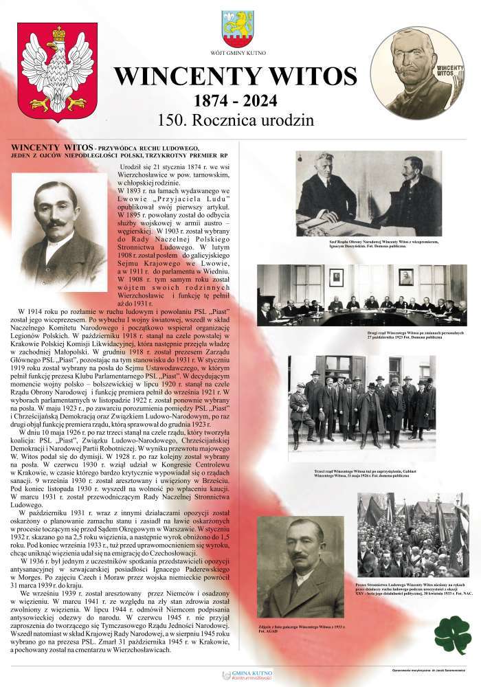 W dniu 21 stycznia 2024 przypada 150. rocznica urodzin Wincentego Witosa - Przywódcy Ruchu Ludowego, trzykrotnego premiera Rzeczypospolitej Polskiej i jednego z ojców Niepodległości Polski. Z tej okazji została opracowana mini wystawa poświęcona Wincentowi Witosowi i dziejom Ruchu Ludowego na terenie Ziemi Kutnowskiej, którą można oglądać przed budynkiem Urzędu Gminy Kutno.