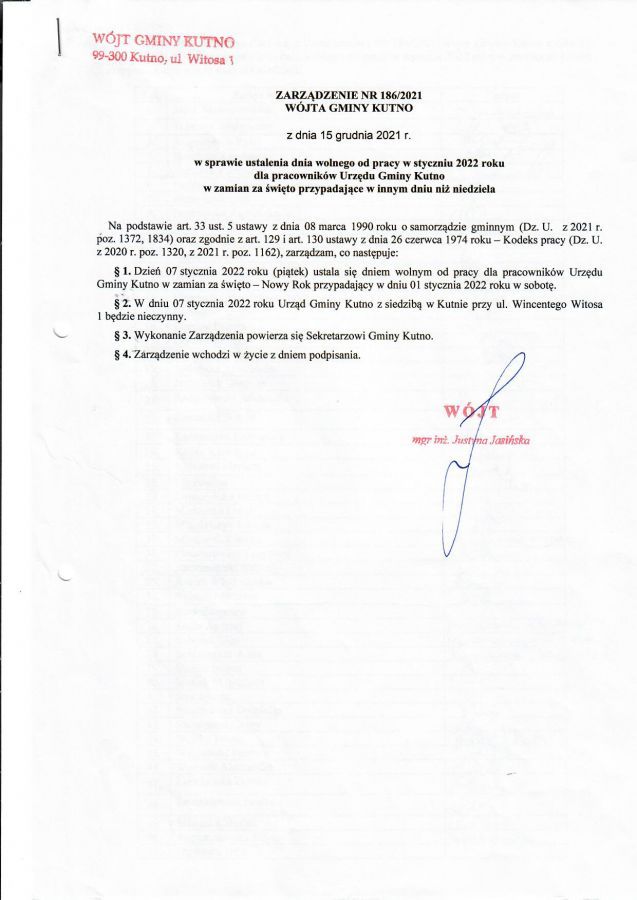 Informujemy, że zgodnie z Zarządzeniem 186/2021 Wójta Gminy Kutno w dniu 7 stycznia 2022 roku Urząd Gminy Kutno będzie nieczynny.