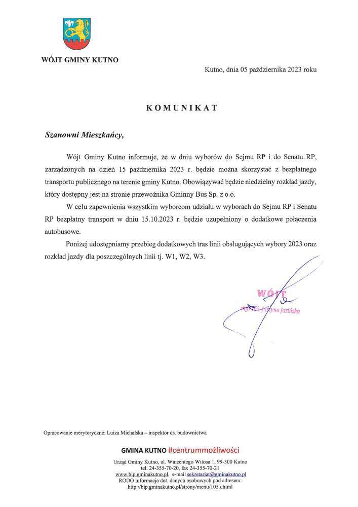 Wójt Gminy Kutno Justyna Jasińska informuje, że w dniu wyborów do Sejmu RP i do Senatu RP, zarządzonych na dzień 15 października 2023 r. będzie można skorzystać z bezpłatnego transportu publicznego na terenie gminy Kutno. Obowiązywać będzie niedzielny rozkład jazdy, który dostępny jest na stronie przewoźnika Gminny Bus Sp. z o.o.