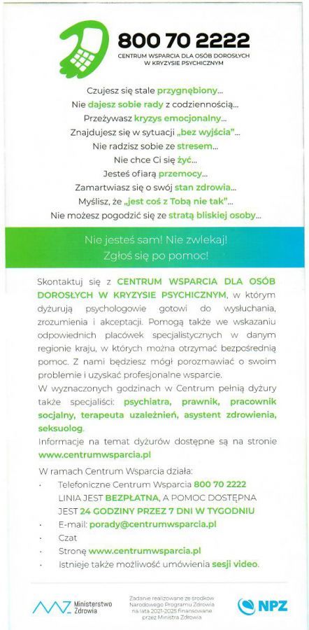Informujemy, że od 1 grudnia 2021 roku działalność wznowiło Centrum Wsparcia dla Osób Dorosłych w Kryzysie Psychicznym. W ramach projektu oferowane jest całodobowe wsparcie psychologiczne oraz kontakt ze specjalistami.