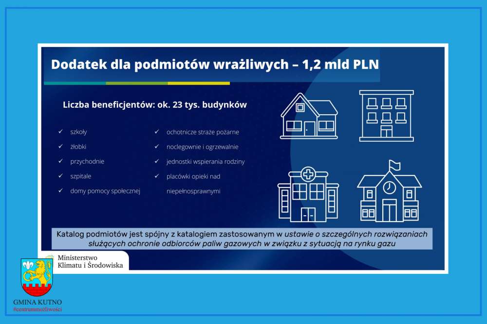 W związku z wejściem w życie w dniu 26 listopada 2022 roku rozporządzenia Ministra Klimatu i Środowiska z dnia 23 listopada 2022 roku w sprawie wzoru wniosku o wypłatę dodatku dla niektórych podmiotów niebędących gospodarstwami domowymi z tytułu wykorzystywania niektórych źródeł ciepła zmieniającym rozporządzenie MKiŚ z dnia 24 października 2022 roku informujemy, że katalog podmiotów wrażliwych został rozszerzonym.in. o: wspólnoty mieszkaniowe, spółdzielnie mieszkaniowe, związki zawodowe. Dodatkowych informacji udzielamy pod nr tel.: 24 355 70 24, bądź w siedzibie Urzędu Gminy Kutno przy ul. Witosa 1 w godzinach 7.30. – 15.30 (pokój nr 2).