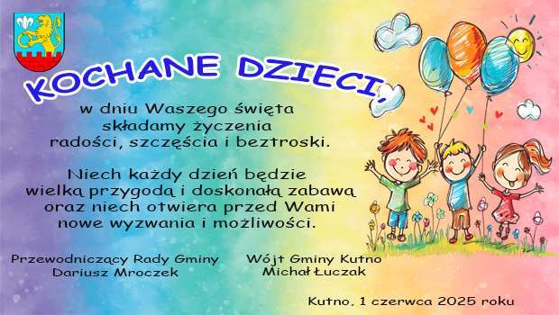 Z okazji Dnia Dziecka wszystkim milusińskim Wójt Gminy Kutno Michał Łuczak i Przewodniczący Rady Gminy Kutno Dariusz Mroczek składają najlepsze życzenia.