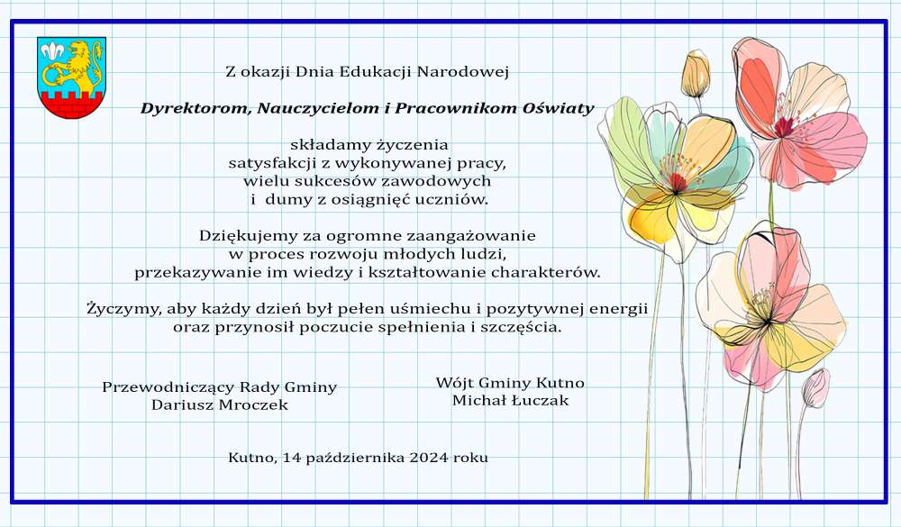 Dziś przypada Dzień Edukacji Narodowej. Z tej okazji Wójt Gminy Kutno Michał Łuczak i Przewodniczący Rady Gminy Dariusz Mroczek składają wszystkim pracownikom oświaty serdeczne życzenia.