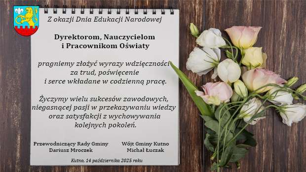 Dziś przypada Dzień Edukacji Narodowej. Z tej okazji Wójt Gminy Kutno Michał Łuczak i Przewodniczący Rady Gminy Dariusz Mroczek składają wszystkim pracownikom oświaty serdeczne życzenia.
