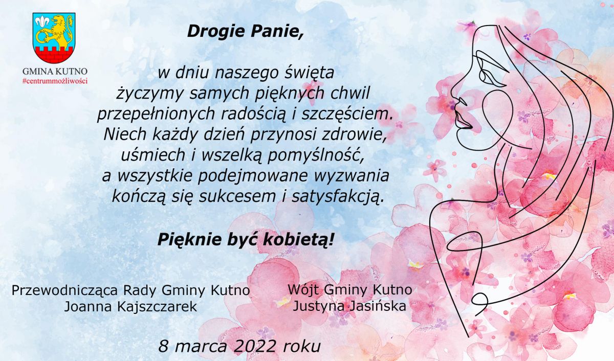 Z okazji Dnia Kobiet Wójt Gminy Kutno Justyna Jasińska i Przewodnicząca Rady Gminy Kutno Joanna Kajszczarek składają wszystkim Paniom najserdeczniejsze życzenia.