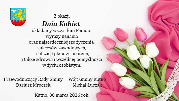 Z okazji Dnia Kobiet Wójt Gminy Kutno Michał Łuczak i Przewodniczący Rady Gminy Dariusz Mroczek składają wszystkim Paniom serdeczne życzenia.