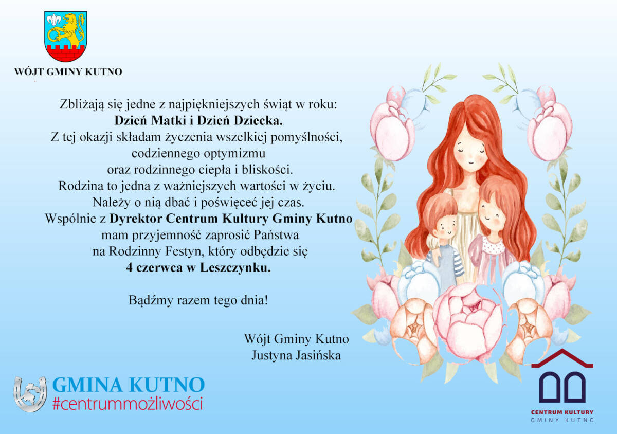 Zbliżają się dwa piękne święta - Dzień Matki i Dzień Dziecka.  Z tej okazji Wójt Gminy Kutno Justyna Jasińska składa serdeczne życzenia i już dziś zaprasza na Festyn Rodzinny.