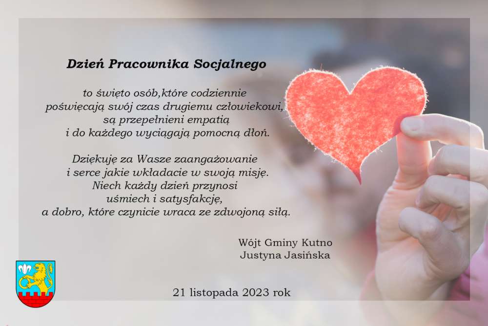 Z tej okazji Wójt Gminy Kutno Justyna Jasińska wszystkim Pracownikom Pomocy Społecznej dziękuje za zaangażowanie w tą trudną i odpowiedzialną pracę, za cierpliwość, serce i ciepło przekazywane drugiemu człowiekowi oraz życzy satysfakcji z pełnionej misji.