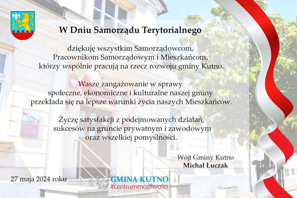 Dziś przypada Dzień Samorządu Terytorialnego. Jest to święto obchodzone na pamiątkę pierwszych demokratycznych wyborów samorządowych z 1990 r. Z tej okazji Wójt Gminy Kutno  Michał Łuczak składa podziękowania wszystkim, którzy przyczyniają się do rozwoju naszej gminy.