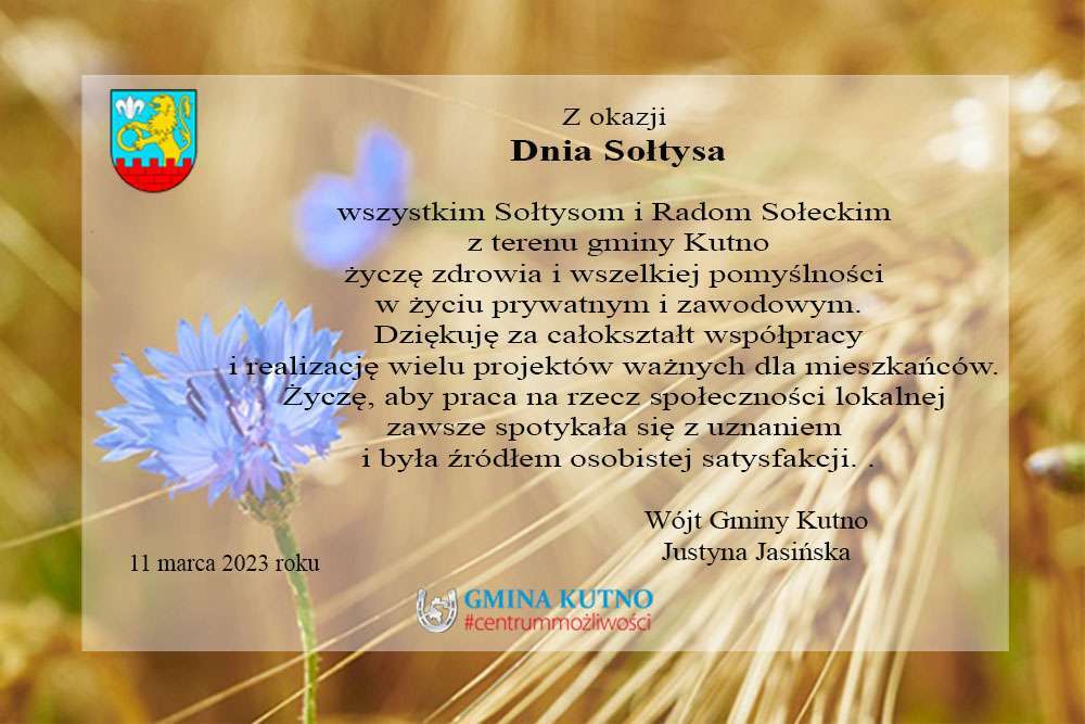 Z okazji Dnia Sołtysa Wójt Gminy Kutno Justyna Jasińska składa Sołtysom i Radom Sołeckim z terenu gminy Kutno serdeczne życzenia.