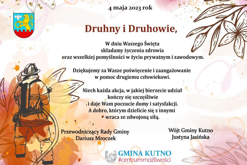 Z okazji Dnia Strażaka Wójt Gminy Kutno Justyna Jasińska  i Przewodniczący Rady Gminy Dariusz Mroczek składają życzenia wszystkim Druhnom i Druhom.