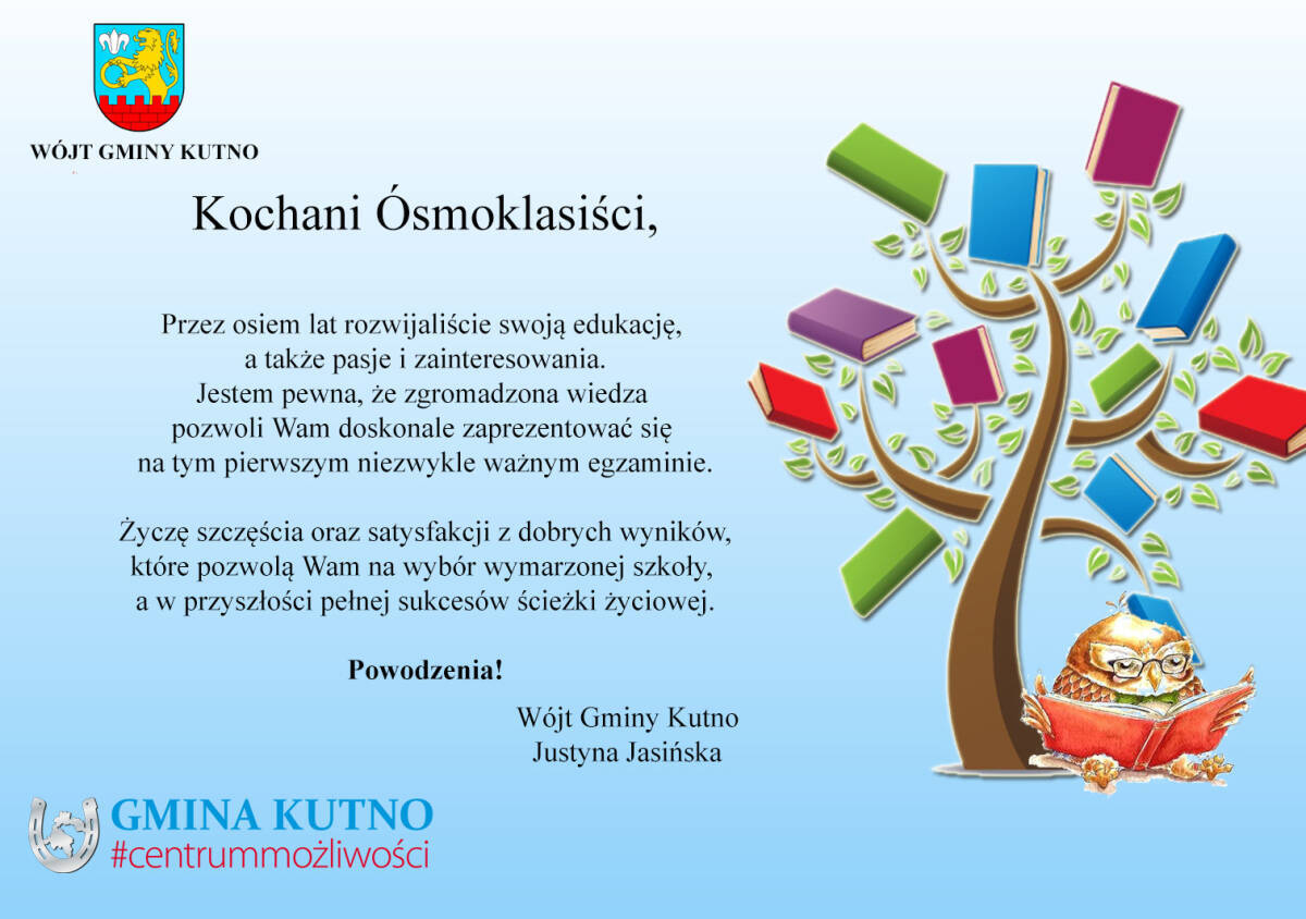 Dziś ważny dzień dla uczniów ósmych klas - rozpoczynają się egzaminy Ósmoklasistów. Z tej okazji Wójt Gminy Kutno Justyna Jasińska życzy powodzenia.