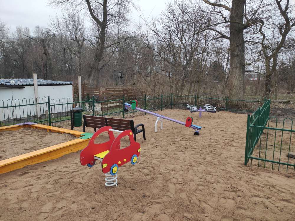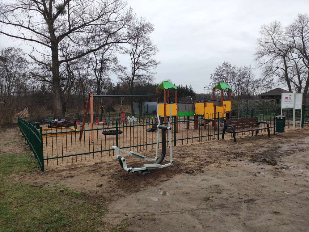 Plac zabaw został ogrodzony , dodatkowo zamontowano ławki i kosze na śmieci.
