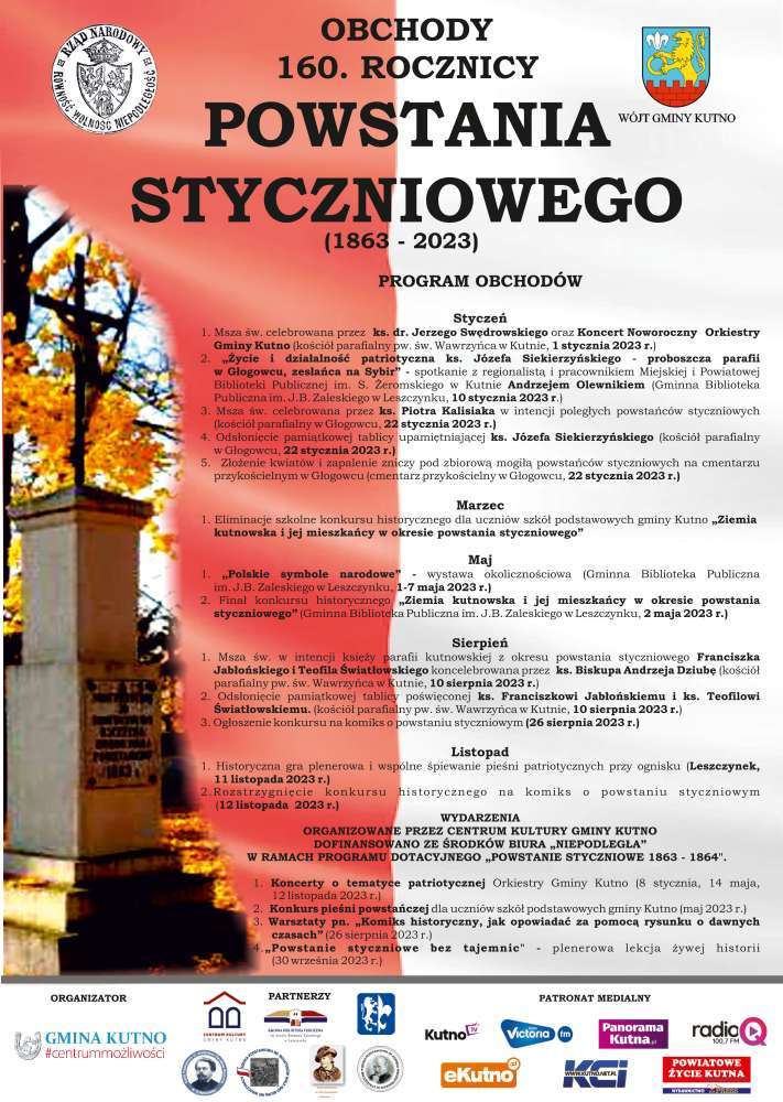 Obchody 160. rocznicy powstania styczniowego będą odbywały się w okresie od stycznia do listopada 2023 roku i będą obfitować w wiele wydarzeń o charakterze patriotycznym, kulturalnym i edukacyjnym takich jak: msze święte, koncerty, konkursy, wystawy czy plenerowa lekcja żywej historii, na które już teraz serdecznie zapraszamy.