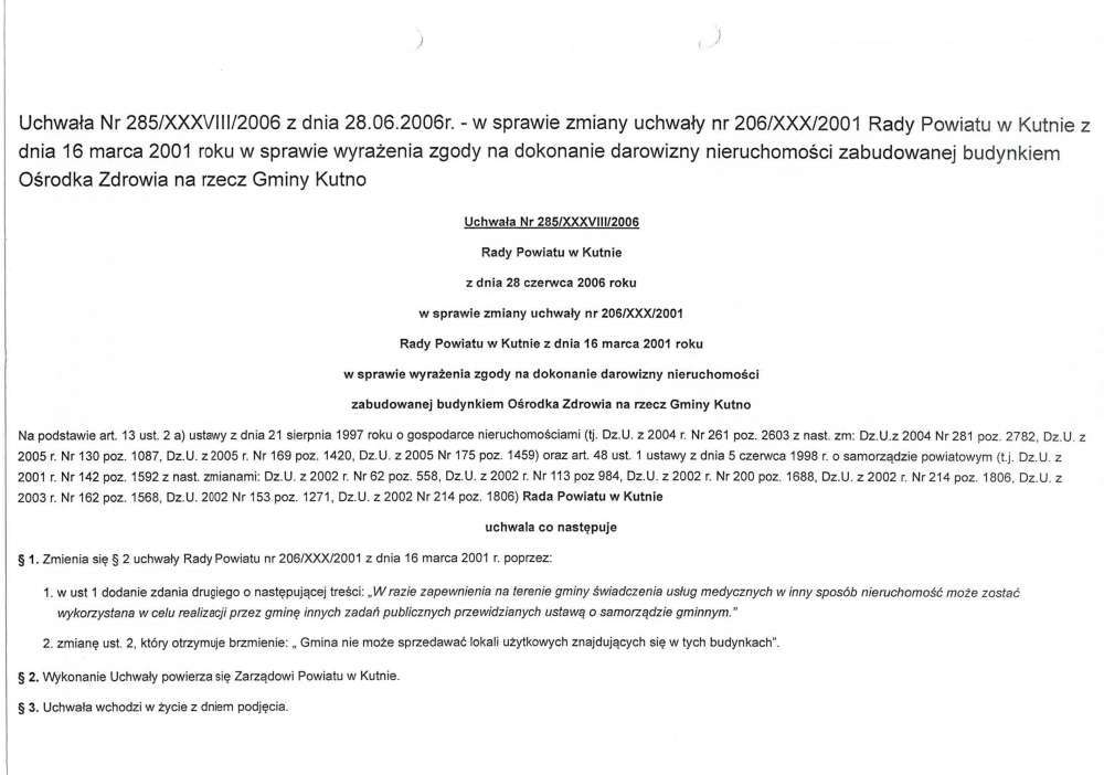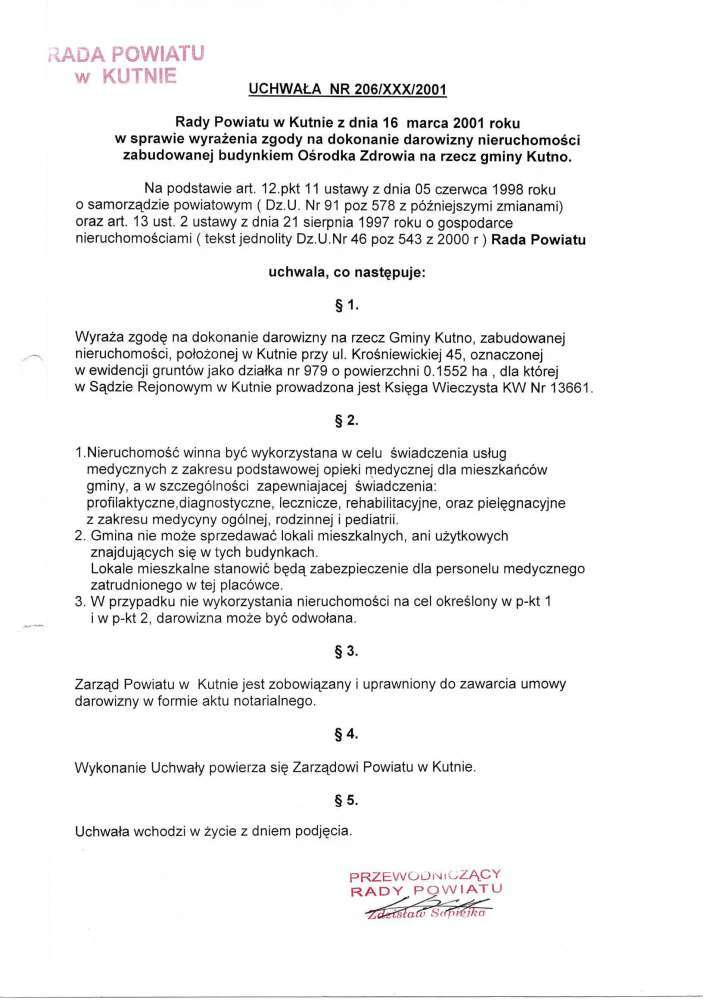 W dniu 04.07.2001 roku Gmina Kutno przejęła w drodze darowizny nieruchomość oznaczoną nr 979 położoną w Kutnie przy ulicy Krośniewickiej 41 na podstawie uchwały nr 206/XXX/2001 Rady Powiatu w Kutnie z dnia 16.03.2001r. w sprawie wyrażenia zgody na dokonanie na rzecz Gminy Kutno darowizny w/w nieruchomości ze wskazanym celem, a mianowicie nieruchomość winna być wykorzystana w celu świadczenia usług medycznych z zakresu podstawowej opieki medycznej dla mieszkańców gminy. Wartość darowizny określono wówczas na kwotę łączną 45 000 zł, w tym: 39 000zł – budynki; 6 000 zł – działka.