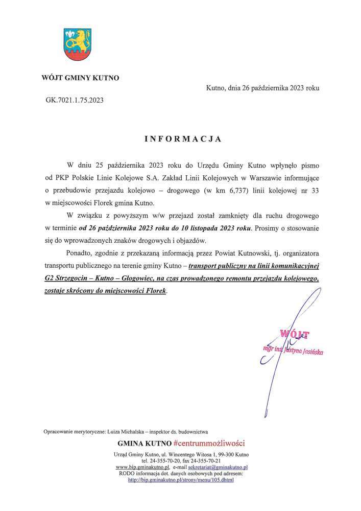 Ponadto, zgodnie z przekazaną informacją przez Powiat Kutnowski, tj. organizatora transportu publicznego na terenie gminy Kutno – transport publiczny na linii komunikacyjnej G2 Strzegocin – Kutno – Głogowiec, na czas prowadzonego remontu przejazdu kolejowego, zostaje skrócony do miejscowości Florek.
