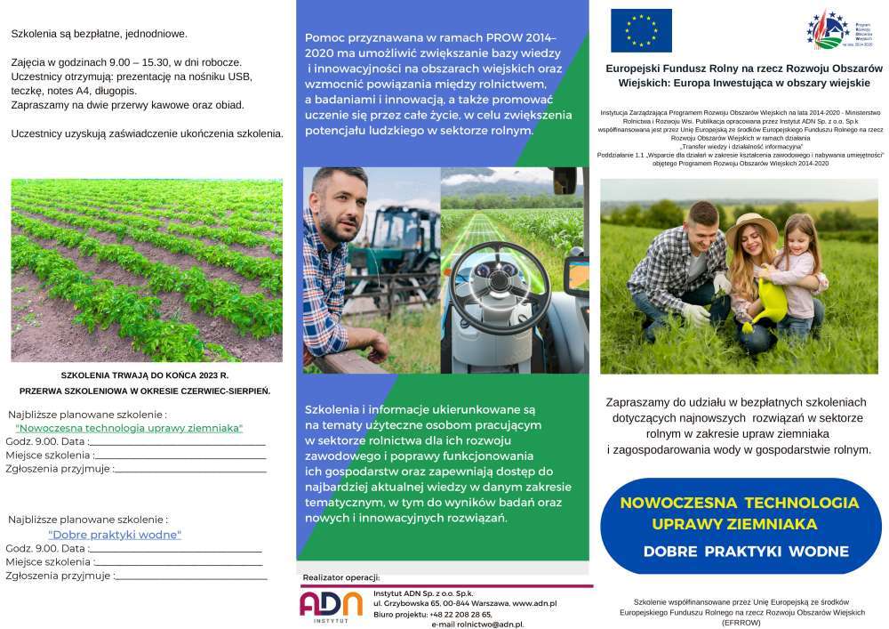 Informujemy, że Agencja Restrukturyzacji i Modernizacji Rolnictwa realizuje program szkoleń dla zainteresowanych rolników w zakresie najnowszych rozwiązań w sektorze rolnym: