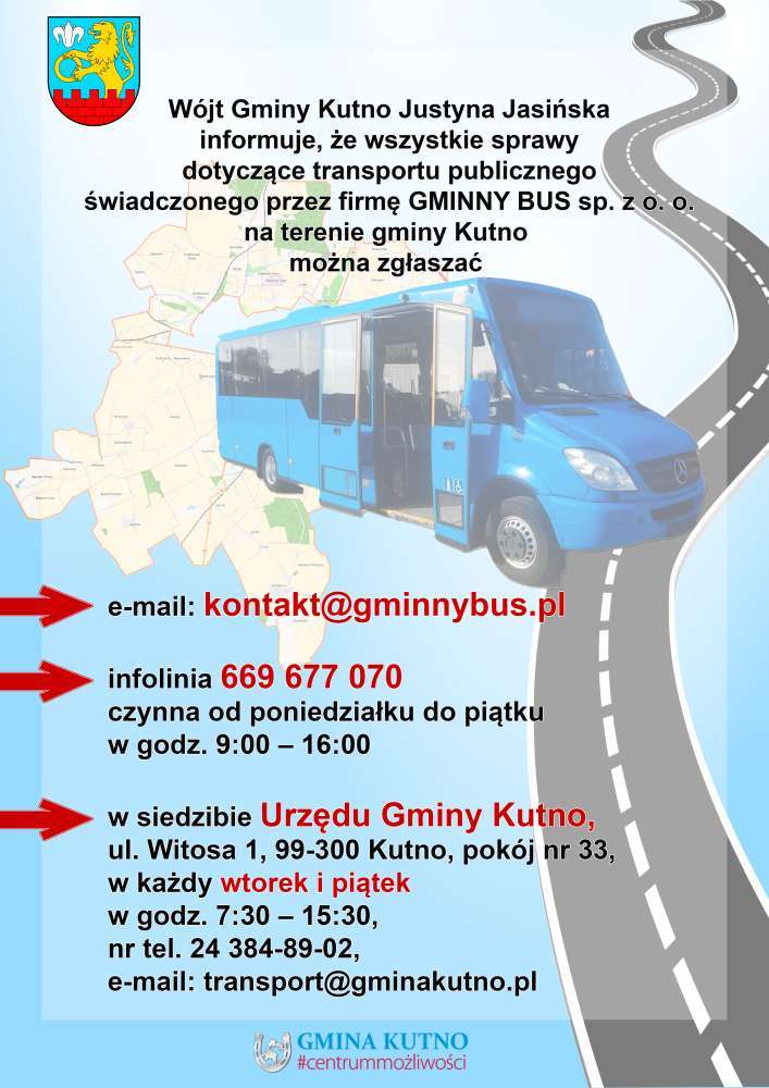 Wójt Gminy Kutno Justyna Jasińska informuje, że wszystkie sprawy dotyczące transportu publicznego świadczonego przez firmę GMINNY BUS sp. z o. o. na terenie gminy Kutno można zgłaszać: