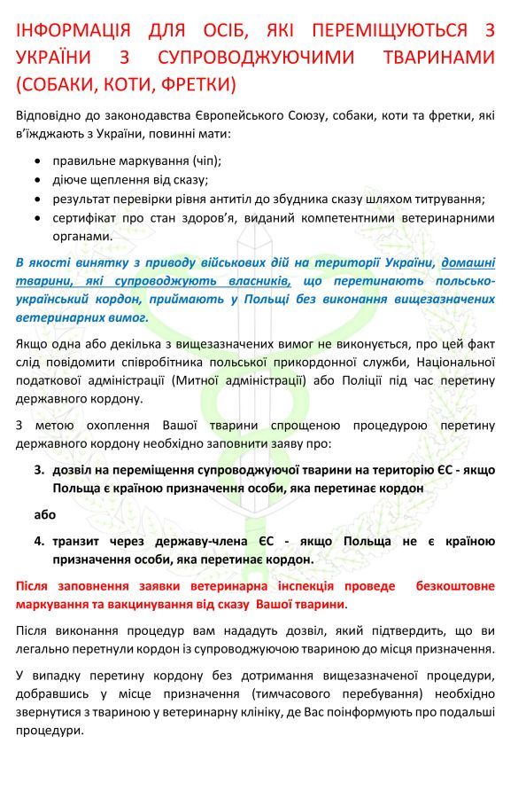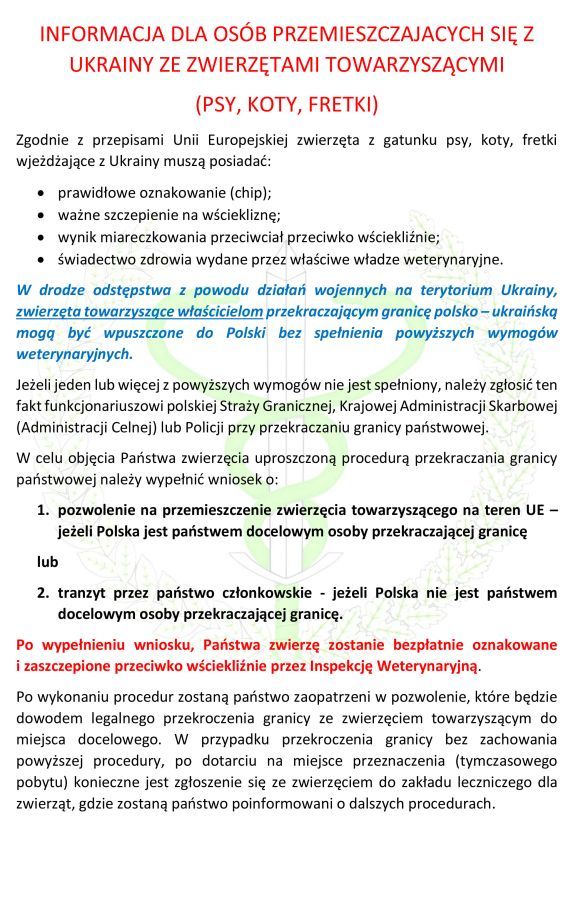 Informujemy, że zgodnie z decyzją kierownictwa Głównego Inspektoratu Weterynarii, w porozumieniu z kierownictwem Ministerstwa Rolnictwa i Rozwoju Wsi oraz z Krajową Administracja Skarbową, zmienione zostały procedury dotyczące wjazdu podróżnych z terenu Ukrainy ze zwierzętami towarzyszącymi przemieszczanymi w celach niehandlowych.