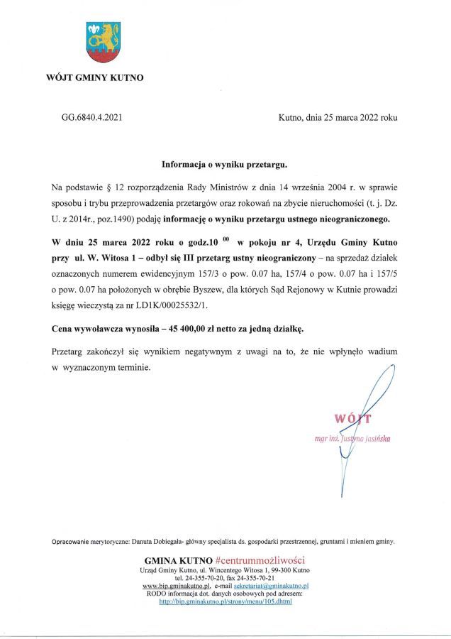 Poniżej informacja o wyniku przetargu na sprzedaż działek o nr 157/3, 157/4 i 157/5 położonych w Byszewie, gm. Kutno