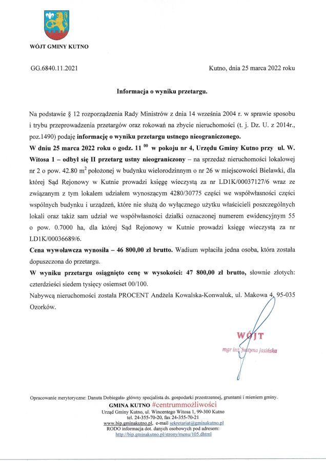 Poniżej informacja o wyniku przetargu na sprzedaż lokalu nr 2 położonego w Bielawkach 26, gm. Kutno