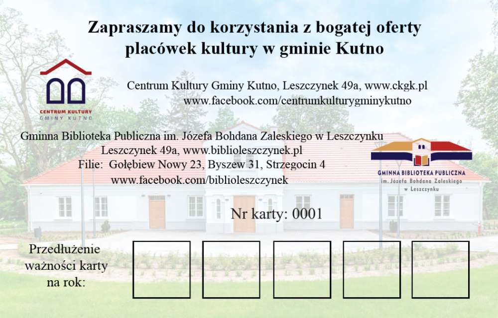 Wójt Gminy Kutno Justyna Jasińska Informuje, iż na podstawie Uchwały Nr LIX/403/2023 Rady Gminy Kutno z dnia 12 stycznia 2023 r. w sprawie przyjęcia Programu pod nazwą „Karta Mieszkańca Gminy Kutno" oraz Zarządzenia Nr 17/2023 z dnia 6 lutego 2023 r. w sprawie określenia wzoru Karty Mieszkańca Gminy Kutno w ramach Programu pod nazwą „Karta Mieszkańca Gminy Kutno", od dnia 6 lutego 2023 roku można składać wnioski o wydanie Karty Mieszkańca Gminy Kutno, uprawniającej do korzystania z ulg i uprawnień w ramach Programu pod nazwą „Karta Mieszkańca Gminy Kutno".