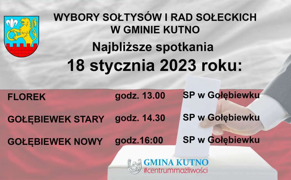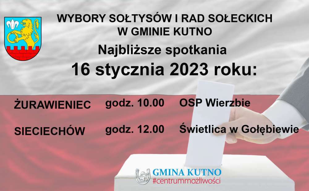 Trwają spotkania sołeckie, na których wybrani są Sołtysi i Rady sołeckie poszczególnych miejscowości w gminie Kutno. Kolejne odbędą się już 16 stycznia 2023 dla mieszkańców Żurawieńca i Sieciechowa oraz 18 stycznia 2023 dla mieszkańców Florka, Gołębiewka Starego i Gołębiewka Nowego. Dokładne godziny i miejsca spotkań znajdziecie Państwo na poniższych grafikach.