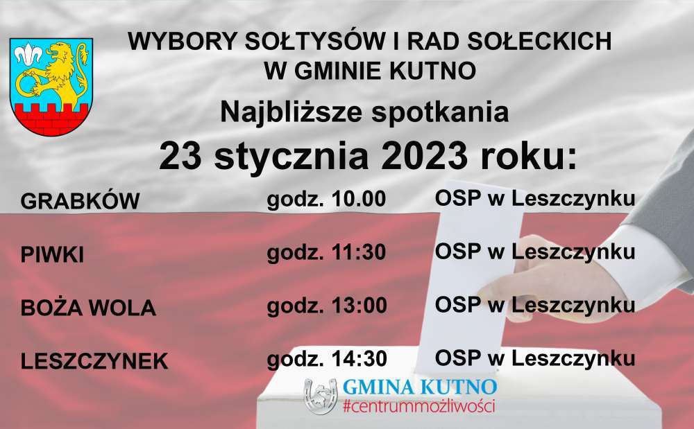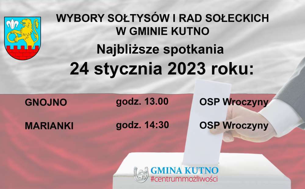 Trwają spotkania sołeckie, na których wybrani są Sołtysi i Rady sołeckie poszczególnych miejscowości w gminie Kutno. Kolejne odbędą się już 23 stycznia 2023 dla mieszkańców Grabkowa, Piwek, Bożej Woli i Leszczynka oraz 25 stycznia 2023 dla mieszkańców Gołębiewa Nowego i Raciborowa. Natomiast 24 stycznia ponownie odbędą się spotkania dla mieszkańców Gnojna i Marianek.
