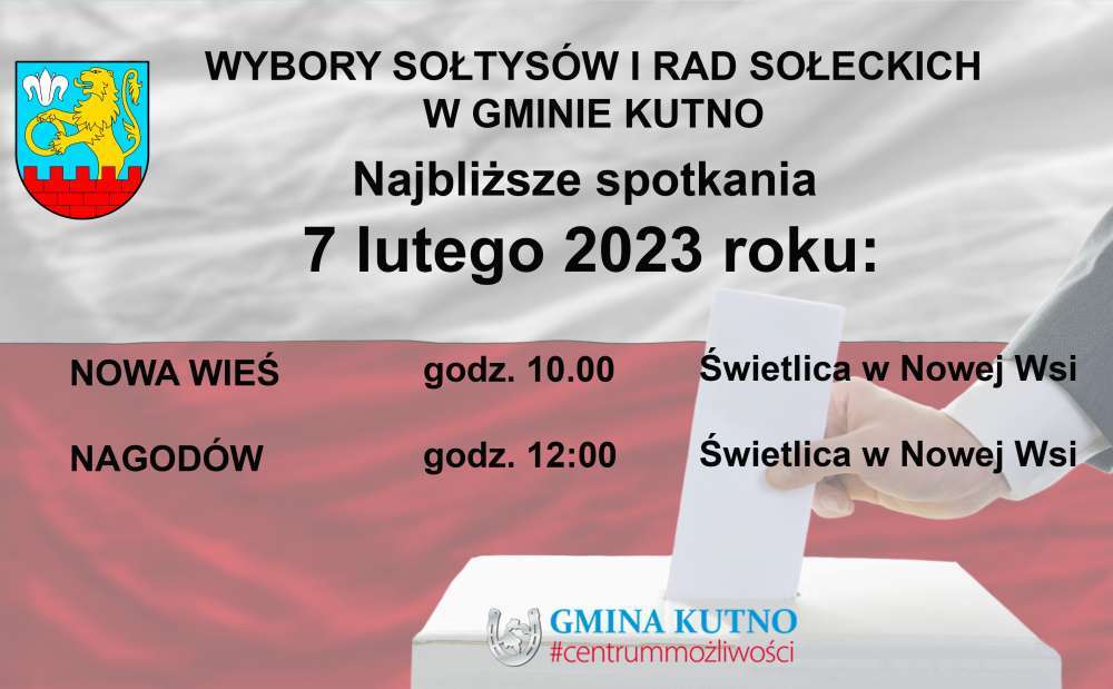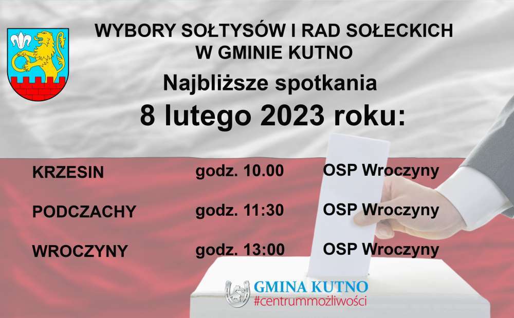 Trwają spotkania sołeckie, na których wybierani są Sołtysi i Rady sołeckie poszczególnych miejscowości w gminie Kutno. Kolejne odbędą się już 6 lutego 2023 dla mieszkańców Grabkowa, 7 lutego 2023 dla mieszkańców Nowej Wsi i Nagodowa oraz 8 lutego Krzesina, Podczach i Wroczyn. Dokładne godziny i miejsca spotkań znajdziecie Państwo na poniższych grafikach.