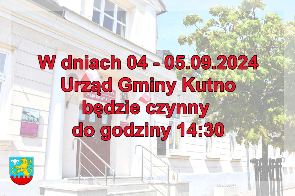 Informujemy, że w dniach 04-05.09.2024 roku Urząd Gminy Kutno, Gminny Ośrodek Pomocy Społecznej i Centrum Usług Wspólnych będą czynne w godzinach 7:30 -14:30. Kasa urzędu będzie otwarta do godziny 13:30