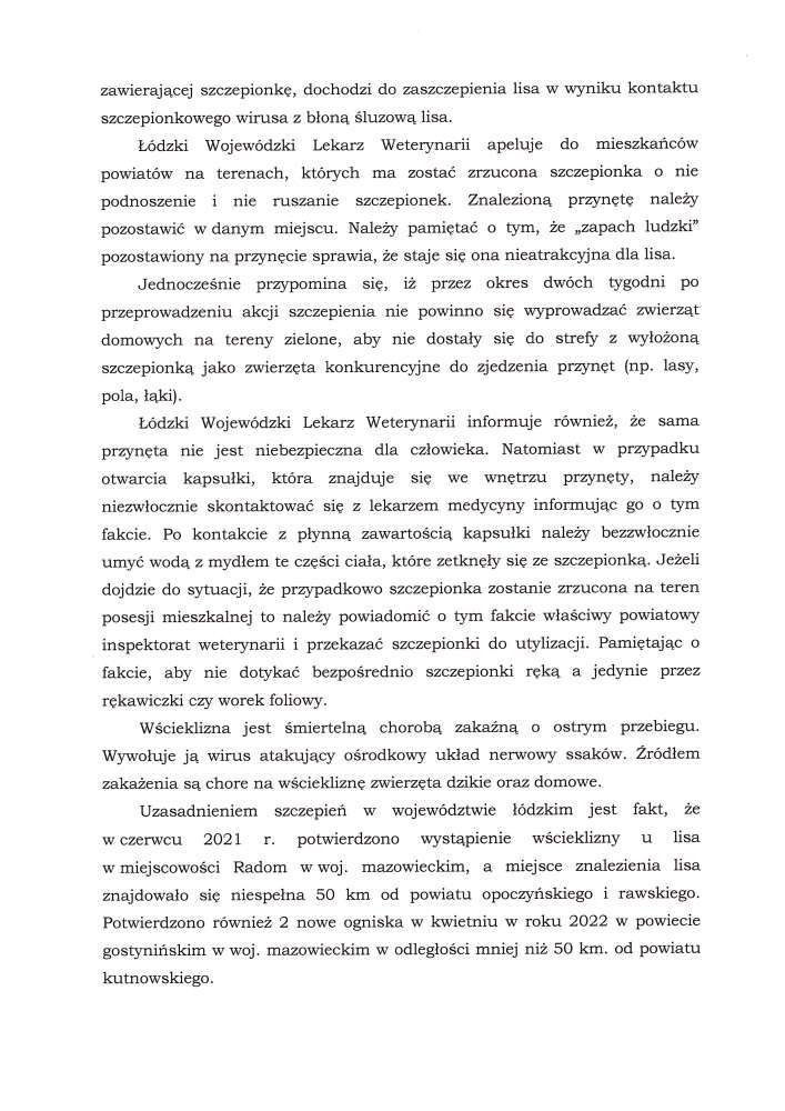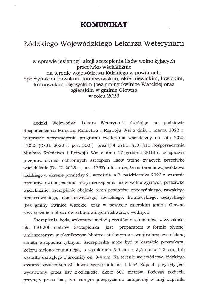 Poniżej treść komunikatu Komunikat Łódzkiego Wojewódzkiego Lekarza Weterynarii dot. szczepienia lisów